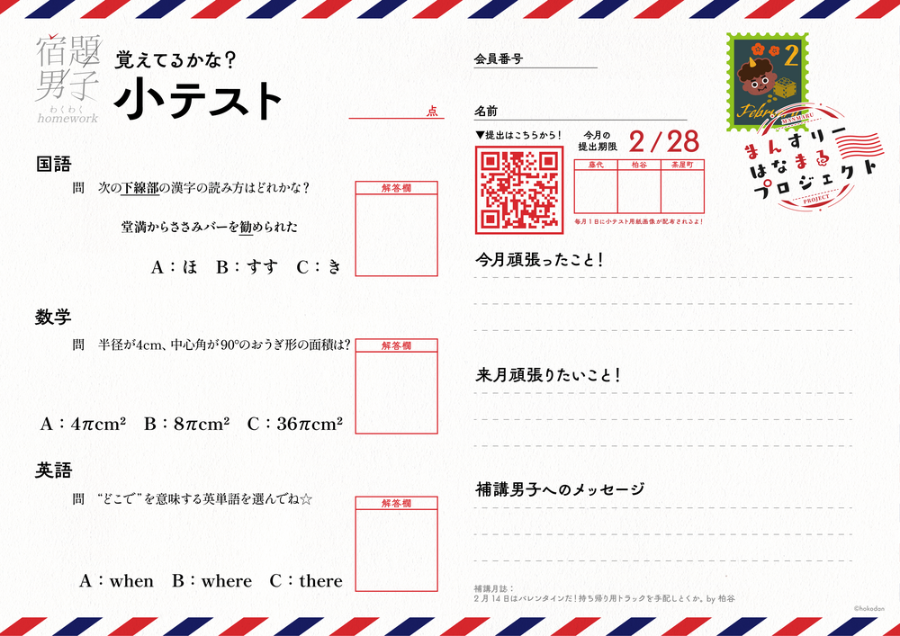【2/28提出〆切】2月小テスト画像ダウンロードはこちら! TEST 補講委員会 - 『補講男子』公式ファンクラブ 2026/02/01 00:00 フォロー ▼画像を長押しで保存して解答を記入しよう! ▼▽▼▽▼▽▼▽▼▽ 提出フォームはコチラ 提出〆切:2月28日 ▽▼提出方法詳細▼▽ URLをコピーする 報告する